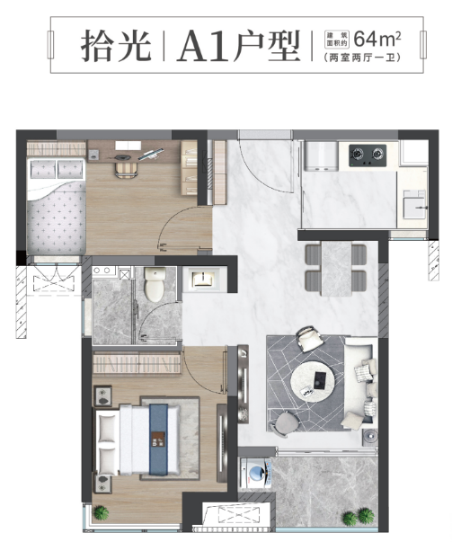 - A1户型(64㎡):二居室设计,南北通透,采光充足。紧凑的空间布局使得每一寸面积都得到了充分利用,适合小两口或单身贵族的精致生活。