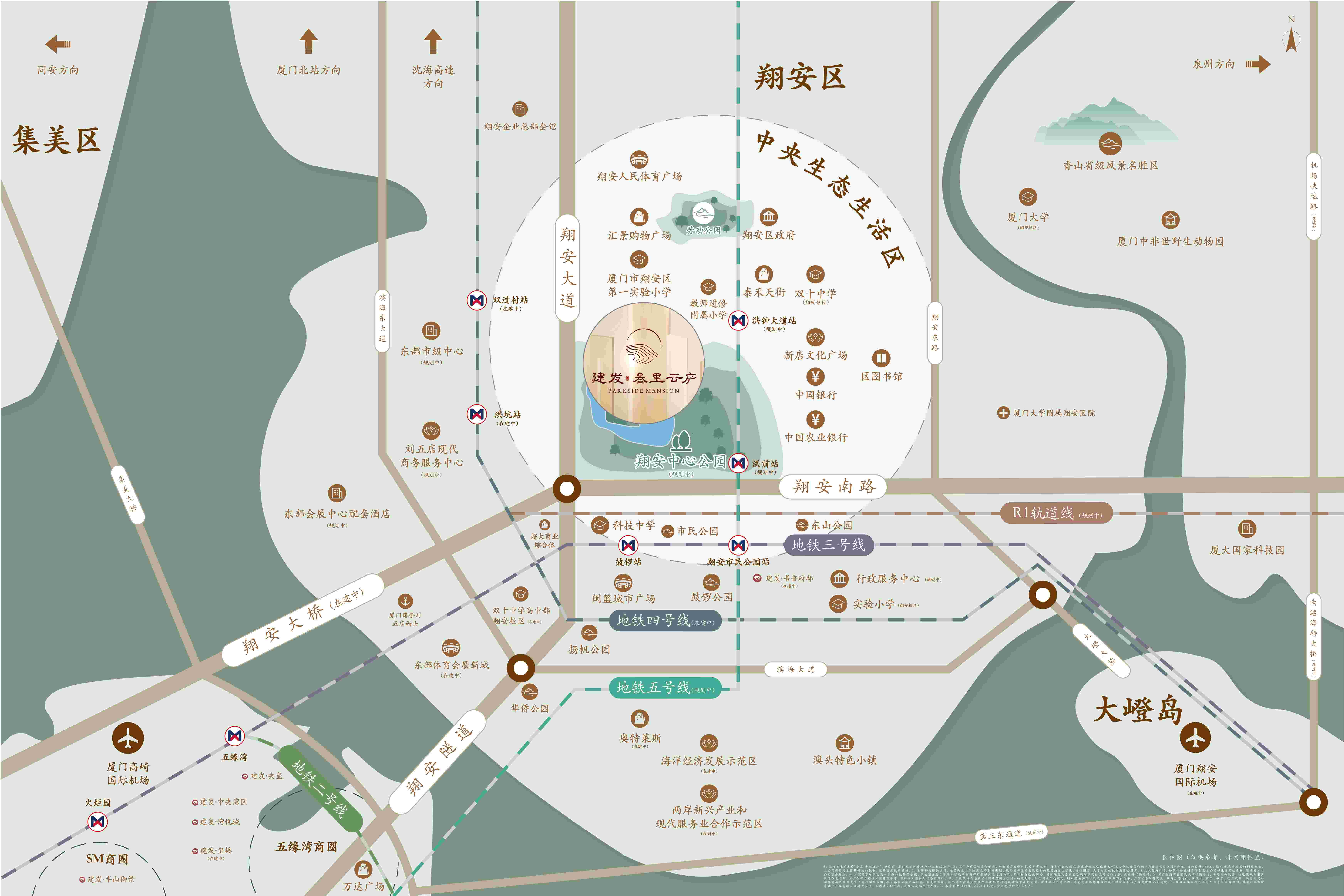 - 交通配套:项目周边交通便捷,拥有翔安大桥(在建中)、翔安隧道、地铁3号线鼓锣站、地铁5号线(规划中)以及厦门翔安新机场等多维交通网络,实现路轨纵横,快速通达全城。