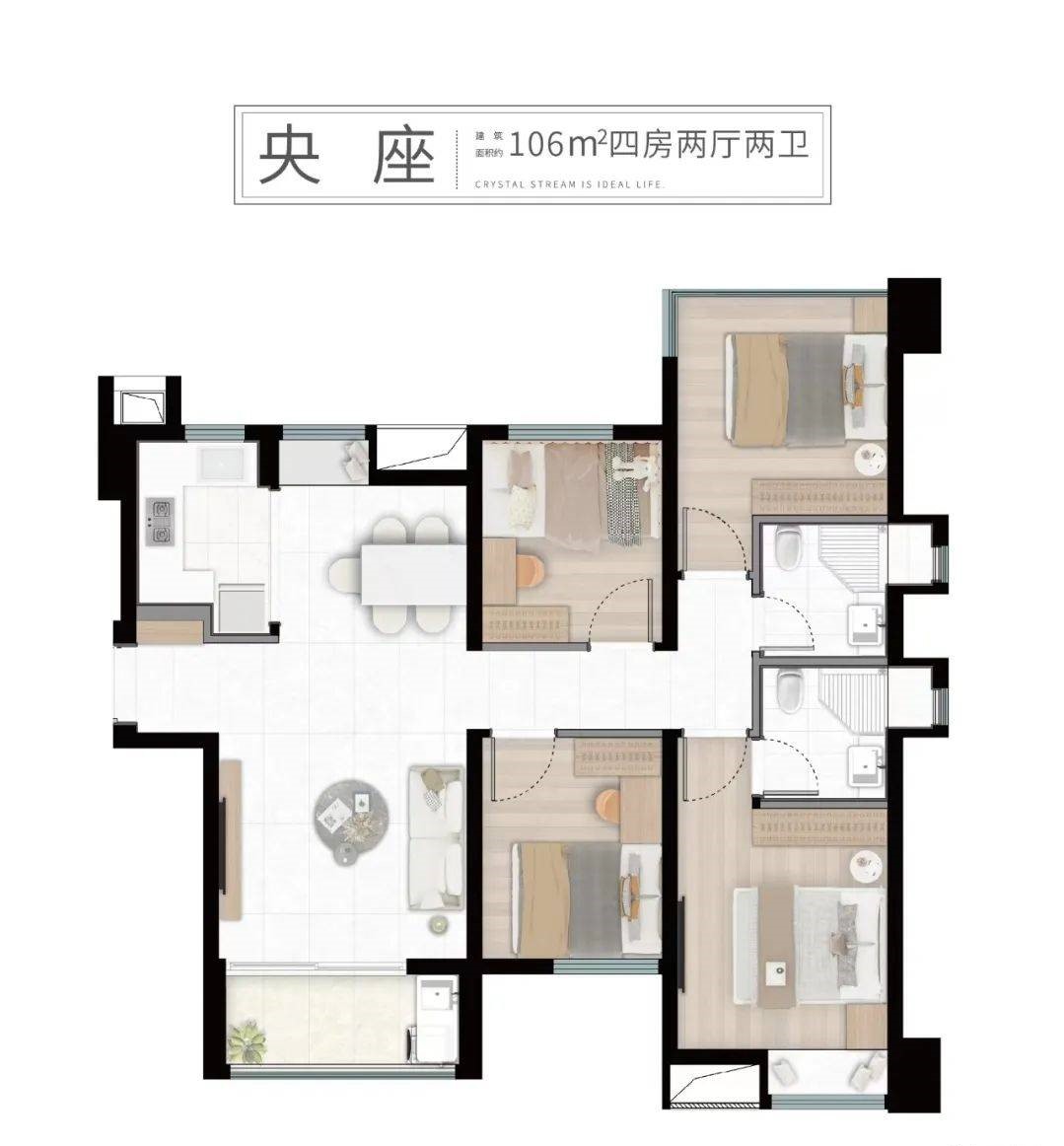 【产品特色】 水晶溪上的产品以建筑面积约80-106平方米的3-4房为主,满足不同家庭的需求。项目绿地率高达38%,容积率为2.7,保证了居住的舒适度与私密性。每一户都经过精心设计,力求在空间布局、采光通风等方面达到最佳效果,让居住者尽享品质生活。