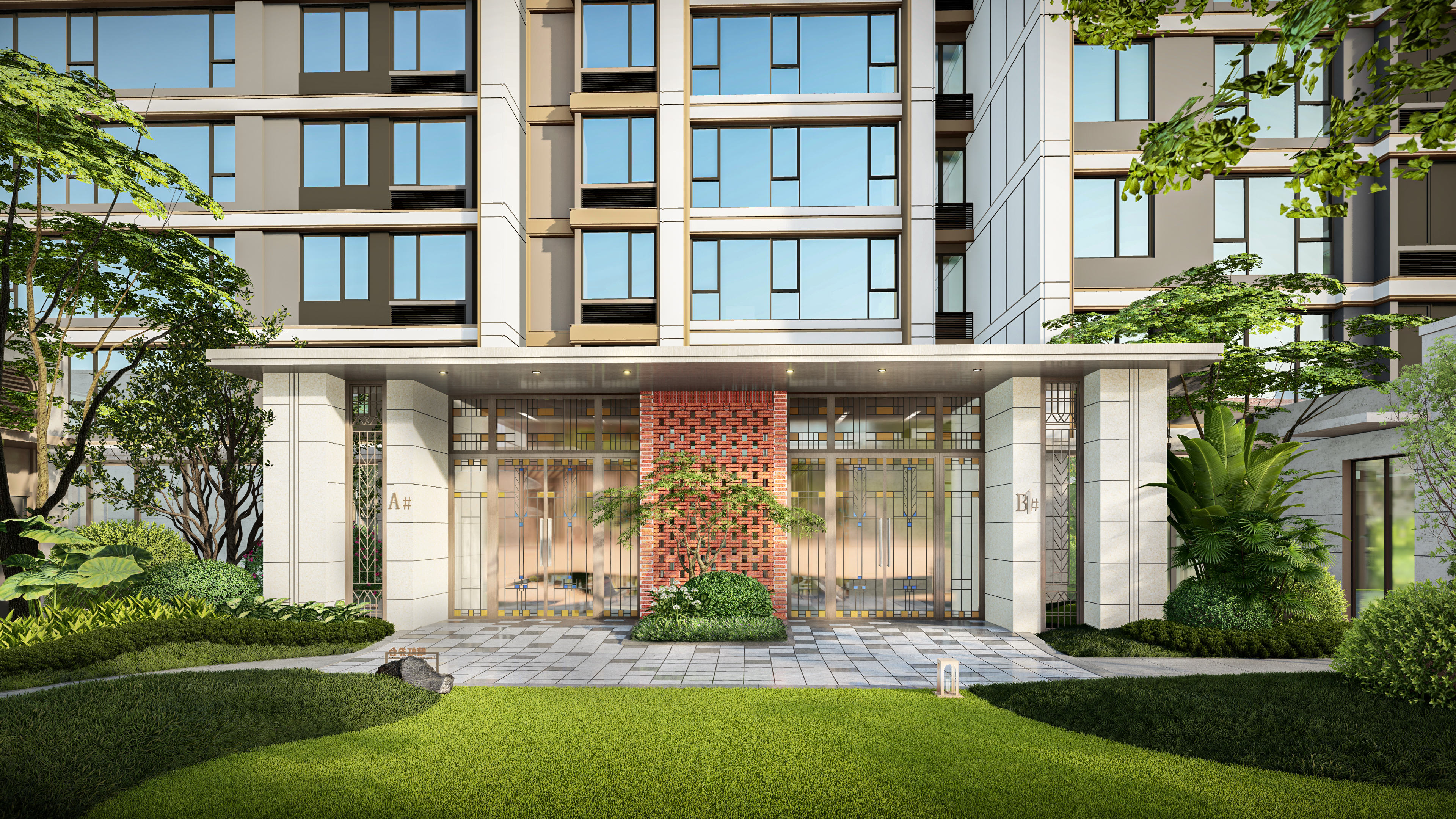 项目选用胭脂红砖镂空砌筑砖墙,形成“胭脂入幕”的独特景观。行走在红砖小道上,仿佛能听见鼓浪屿的故事娓娓道来,每一块砖都承载着历史的厚重与文化的传承。门廊下的花砖更是将鼓浪屿的细节铺叙进归家的漫步道当中,让空间瞬间生动起来,充满了诗意与画意。项目还精心打造了一个秘境花园,灵感源于城市口袋公园的典范——美国佩雷公园。这个花园精选了天堂鸟、缅栀子等臻稀植物,通过组团式布局,打造出一个“人在岛中游”的互动式景观。林下道路随地形变化形成立体丰富的动线,伴着汀步道步步深入,仿佛走进了一幅海岛画卷,每一步都是一次心灵的洗礼。