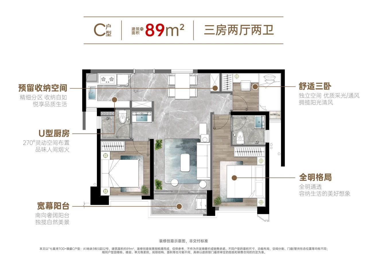 多样化户型:满足不同人群需求 在项目中,二期A1地块的3#和8#楼提供了多样化的户型设计,从89平方米的三房两卫到119平方米的四房两卫,满足了从小家庭到大家庭的不同居住需求。这种灵活多变的户型设计,不仅体现了项目的人性化考量,也展示了其对未来生活方式的深刻洞察和精准把握。