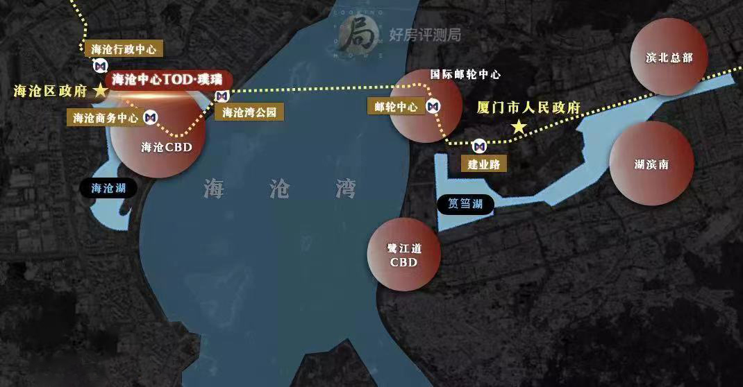 坐落于厦门市海沧区南部新城中央商务区(CBD)的核心区域,具体位置处于南片区东屿北路与沧凤路的交汇处南侧。该区域地理位置得天独厚,东面临海,西面依湖,占据了南部新城最为优越的地理位置。项目距离南侧的漫乐城(厦门中心商业综合体)仅400米,西侧则紧邻海沧湖水秀公园,与阿罗海城市广场仅一桥之隔。交通方面,项目临近海沧大道、滨湖路、南海三路等城市主干道,北侧300米处设有地铁2号线海沧商务中心站,交通出行极为便利。