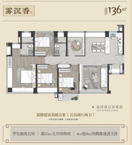 采光与通风:南向约14.2米的四开间设计,确保室内采光和通风。 颠覆性设计与空间拓展 建发·五缘鲤的136㎡五房户型更是颠覆了传统设计理念,整体空间综合使用率高达约87%。项目创新性设计了约7米的巨幕横厅,既可以作为豪华四房,也能灵动拆分为宽松五房,将岛内五房门槛从190㎡直线下调至130㎡+。通过飘窗的技术升级,使得全屋带有足足9个飘窗+1外阳台,极大地扩展了居住空间和观景视野。
