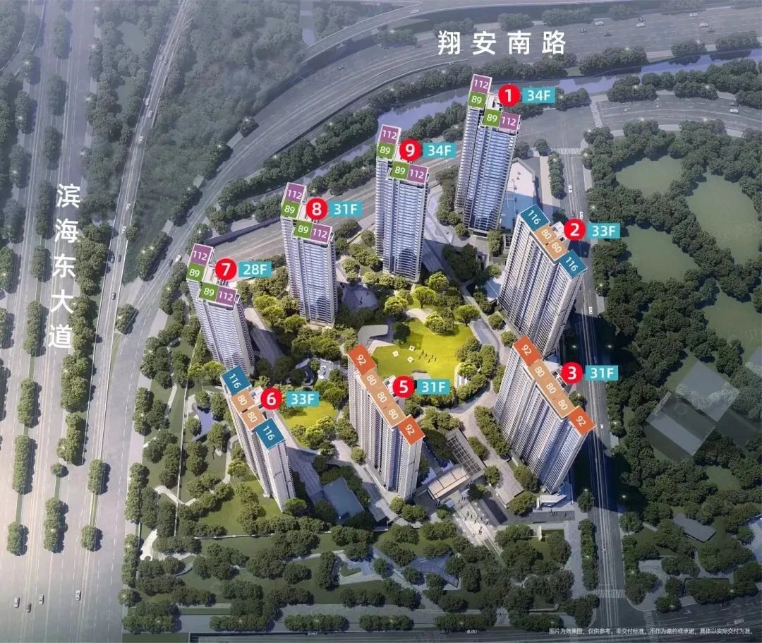 建筑美学:海天一色尽收眼底 项目规划有8栋高层住宅,错落有致地布局于地块之上。部分楼层以上可观赏到壮丽的海景及奥体地标,尤其是6、7号楼前排瞰海,10层以上的住户更能尽享五缘湾外海的绝美风光。同时,1、8、9号楼的西侧也拥有开阔的景观视野,让业主在享受城市便利的同时,也能亲近自然,放松身心。