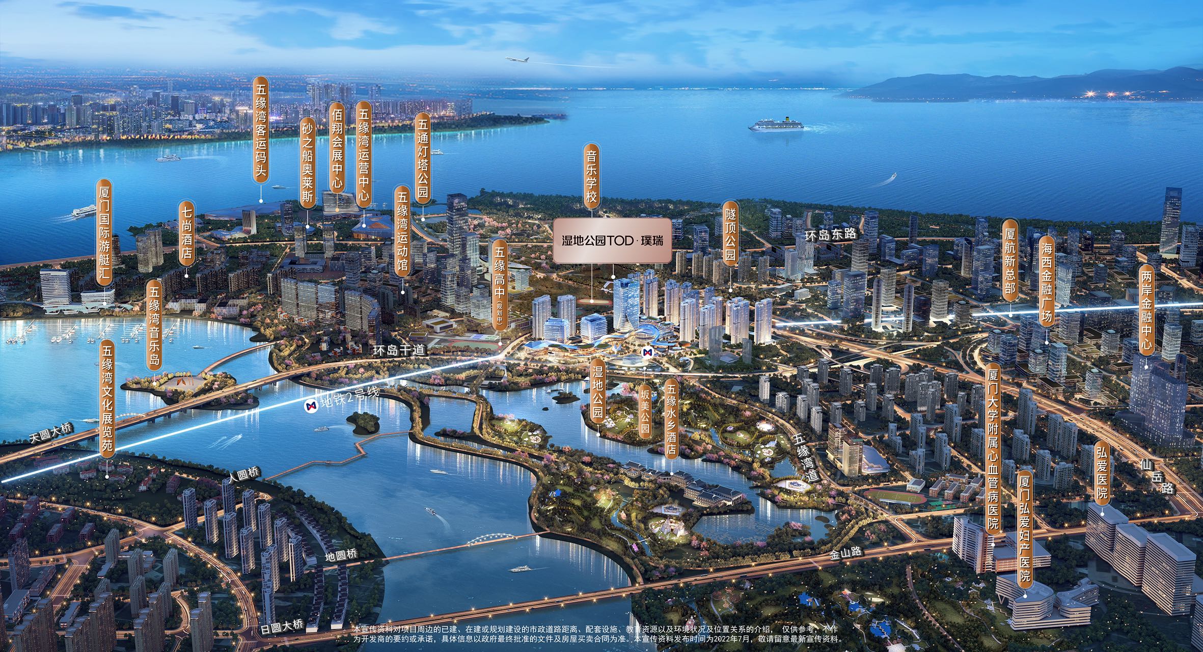 此外,项目还临近湾悦城、天虹、湖里万达等大型商业体,形成了一个繁华的商业圈,满足了居民的日常购物和娱乐需求。项目周边教育资源丰富,邻近市属九年制厦门市音乐学校,以及规划中的五缘高中,这些优质的教育资源为项目增添了浓厚的文化氛围,也为下一代提供了良好的教育环境。项目周边的高端住宅区,更是汇聚了众多精英家庭,形成了一个高素质的社区环境。湿地公园TOD | 璞瑞项目周边生态环境优美,紧邻五缘湾湿地公园和隧顶公园,这两个公园的总面积达到了约102公顷,相当于半个鼓浪屿的面积。项目还创新性地设计了空中悬浮飘带,将两大生态公园串联起来,形成了一个独特的绿色生态走廊,为居民提供了丰富的休闲空间和自然体验。在医疗资源方面,项目周边拥有厦门弘爱医院、厦门大学心血管病附属医院、复旦中山厦门医院等三家优质医疗机构,为居民提供了完善的医疗保障,确保了居民的健康和安全。
