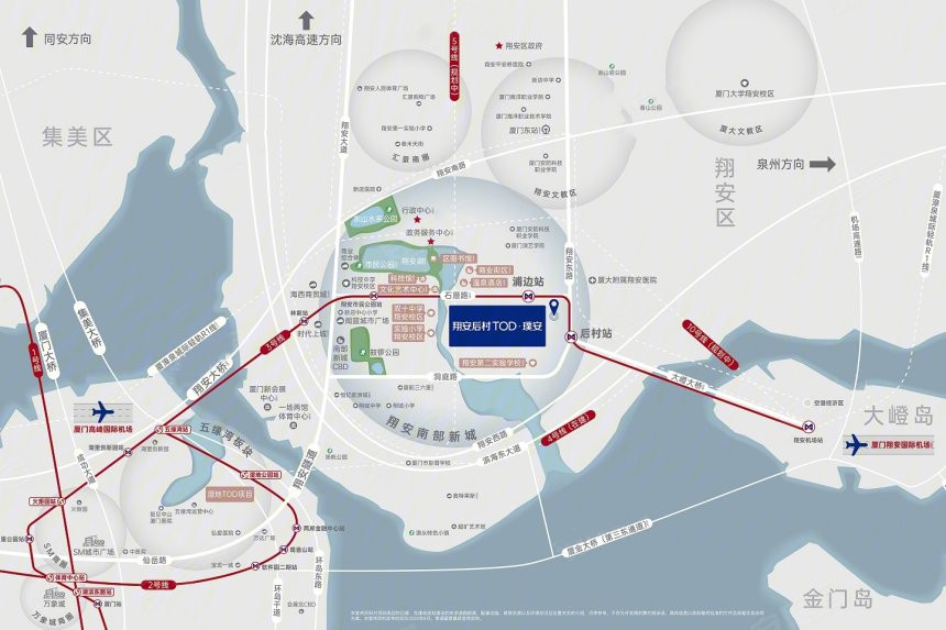 项目靠近厦门大学附属翔安医院,坐拥3号线浦边站、后村站双地铁口,步行距离约200米地铁站,实现开门进地铁,高效速达五缘湾,串联翔安及本岛量级配套、产业区、商业圈等,快速抵达厦门站、体育中心、湖里火炬园、新会展、新机场等量级配套。