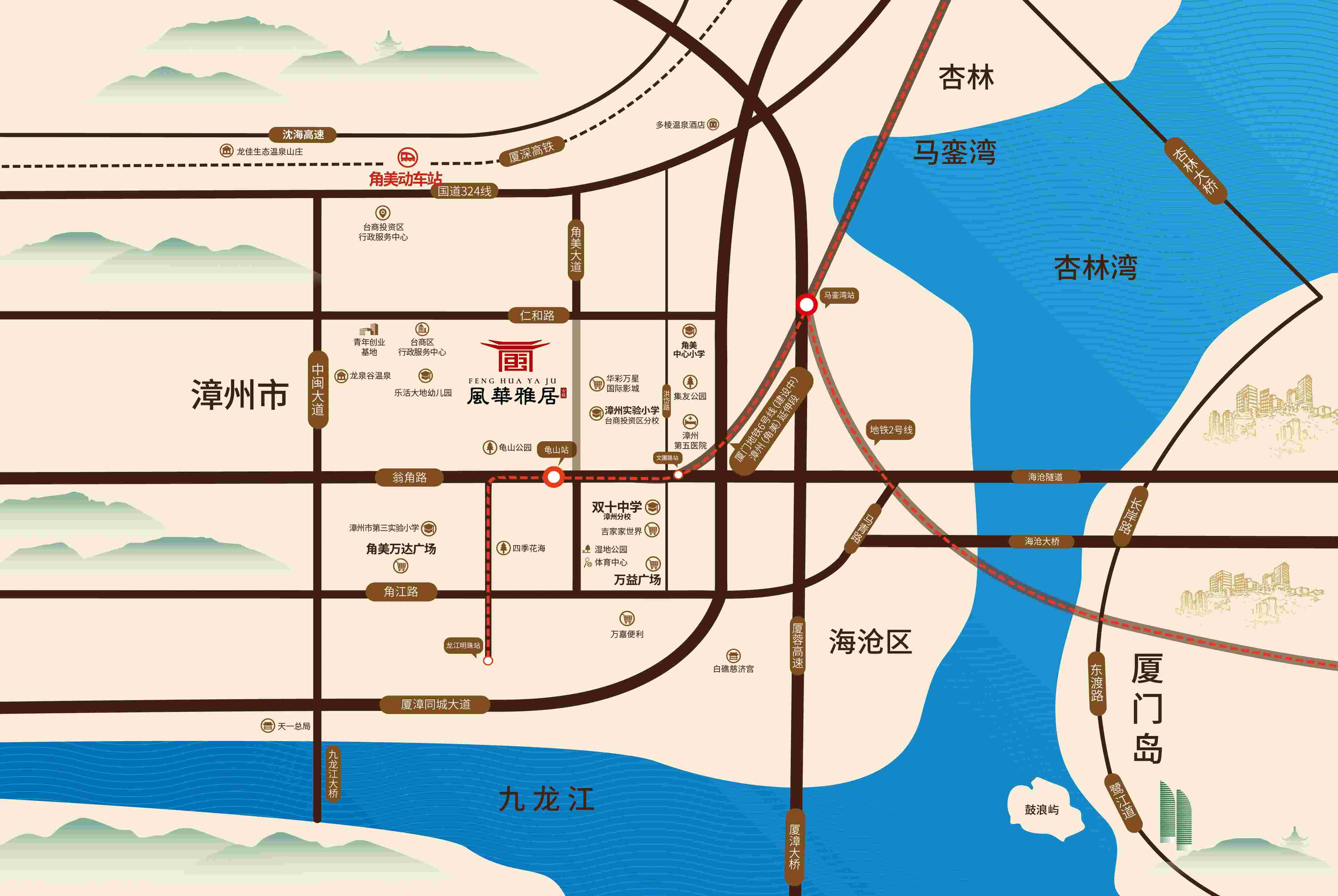 风华雅居是由厦门十大国企轻工集团子公司——古龙地产开发。项目地处漳州台商投资区角美大道与仁和西路交叉口西南侧,位于角美成熟文教核心生活片区,毗邻地铁6号线文圃路站。
