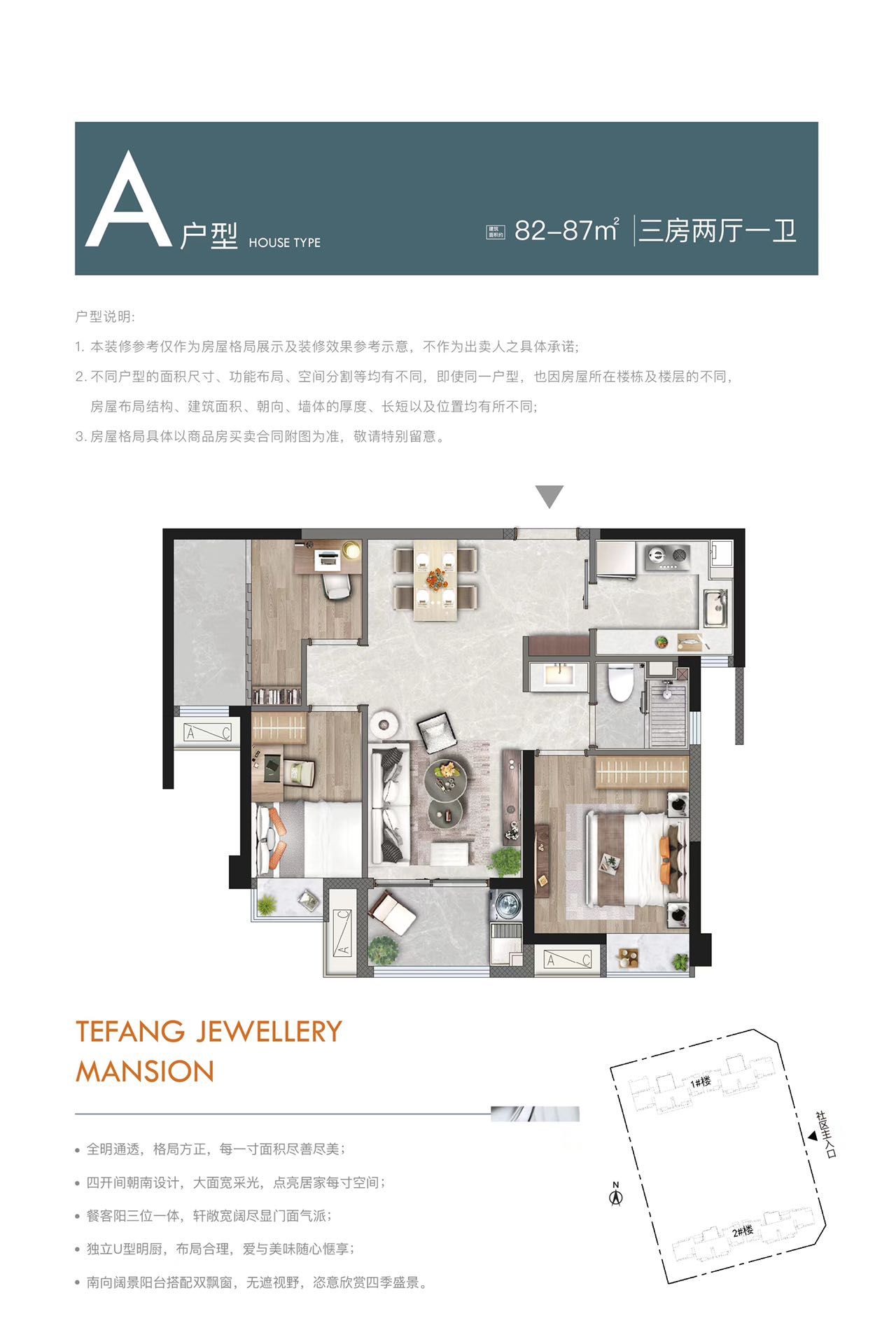 特房新玥公馆精心打造了建面约84㎡的全广角三房两卫户型,以满足家庭需求为出发点,通过人性化的设计,打造了独具特色的小家庭生活空间。在这里,居民可以尽情享受阳光和欣赏美景,让每一天都充满了诗意与温馨。