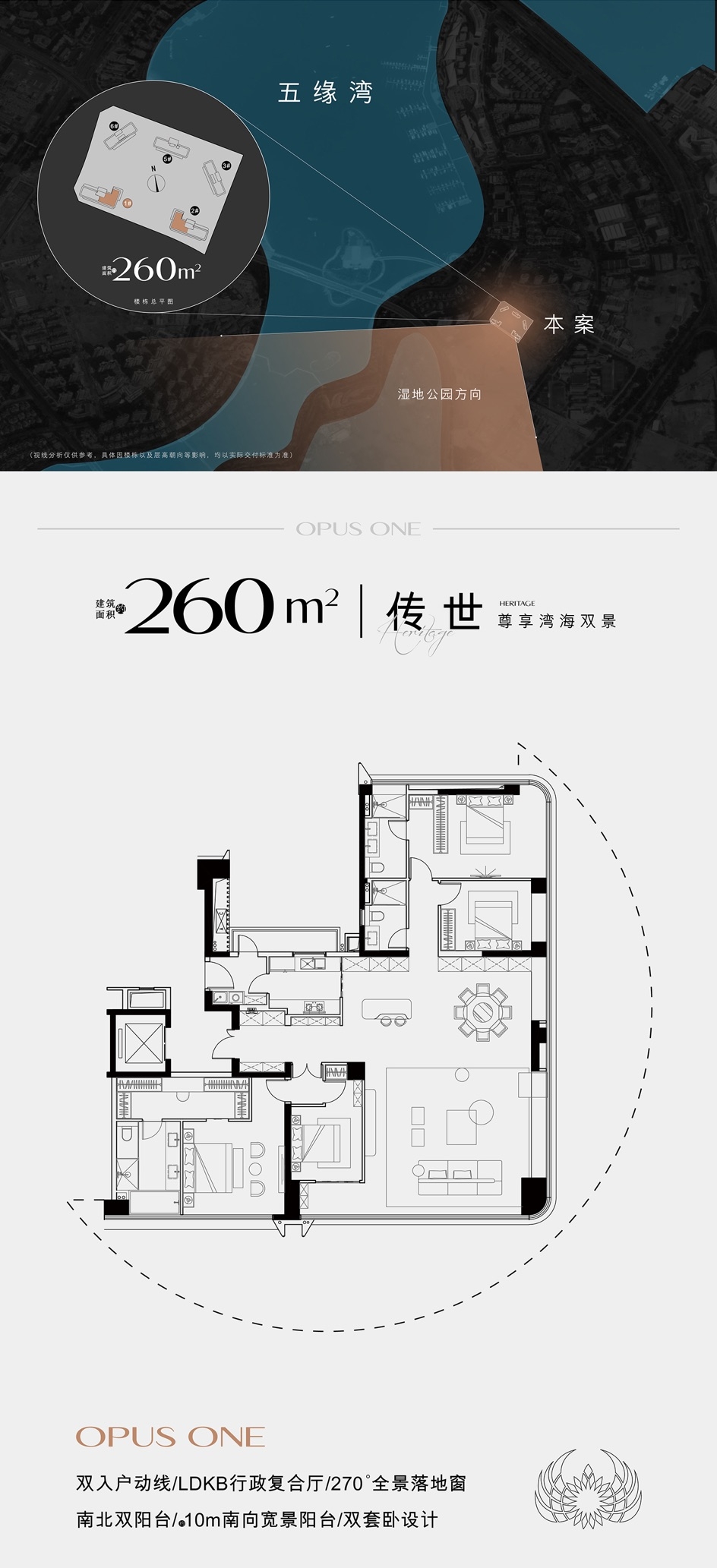 对于260平米的户型,位于1#和2#楼,共有58套。由于楼栋之间的遮挡问题,一般要达到较高楼层才能享受到景观,而260平米户型在4层以上即可拥有无遮挡的景观视野。此外,主卧约有41平米,南向约7米的无敌景观视野,每个房间都可欣赏到景观。双阳台设计则让居住者既能享受景观,又能晾晒衣物,极大提升了客厅赏景的愉悦度。