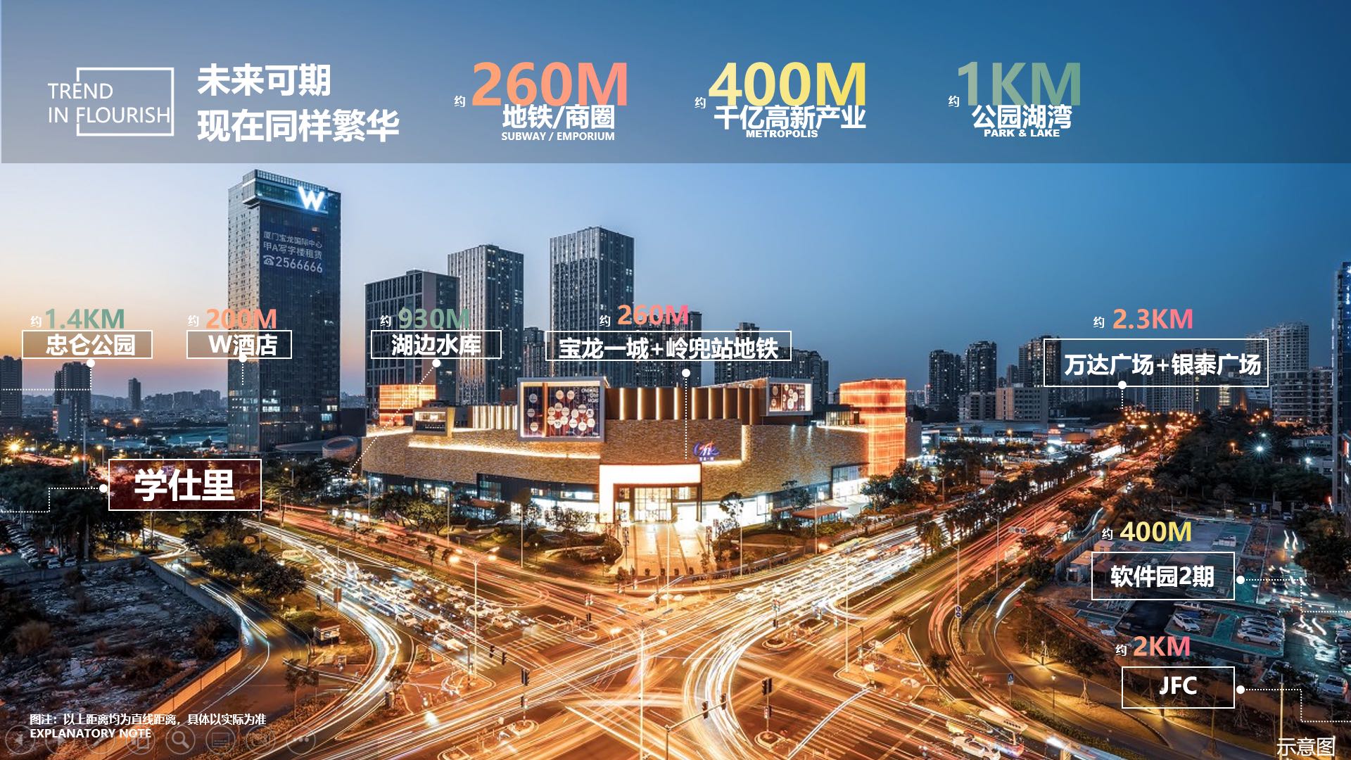 项目周边生活便利,与宝龙一城仅一街之隔,汇聚了加州商业广场、瑞景商业广场等七大商圈,且开元中央公园、忠仑公园等多个公园环绕,为居民提供了丰富的休闲娱乐选择。此外,周边还有优质医院和各种娱乐设施,满足了居民日常生活的各种需求。项目优势: