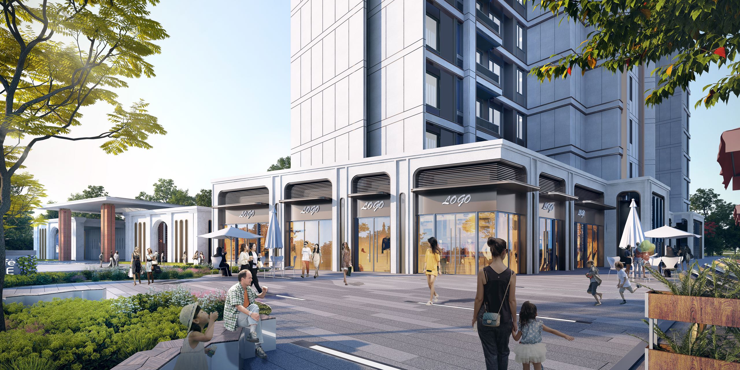 在景观设计上,联发保利·臻樾同样不遗余力。项目创新性打造出具有内场的景观,通过连续的庭院和口袋的花园,以及院、庭、廊的功能空间,形成层次丰富的景观效果。社区主入口用层次递进的景墙与高差形成更好的内场空间,营造了具有围合感的前庭效果。而交错的石材拼色形成的细腻纹理,以及中心点缀的水景,都营造出了经典的迎宾仪式感。