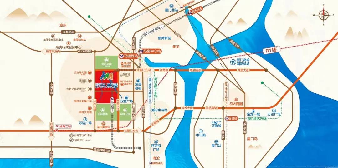 角美地理位置优越,交通便捷。厦门地铁6号线龟山站(在建)的开通,将使得角美与厦门的联系更加紧密。此外,R1城际轻轨(规划中)、角美高铁站等多元交通方式,使得角美居民能够轻松享受双城生活。同时,角美还拥有完善的城市快速路和高速公路网络,无论是前往厦门岛内还是漳州其他地区,都只需30分钟左右的车程。轮船和飞机出行也同样便捷,海沧码头、漳州港码头以及高崎机场,为角美居民提供了多样化的出行选择。