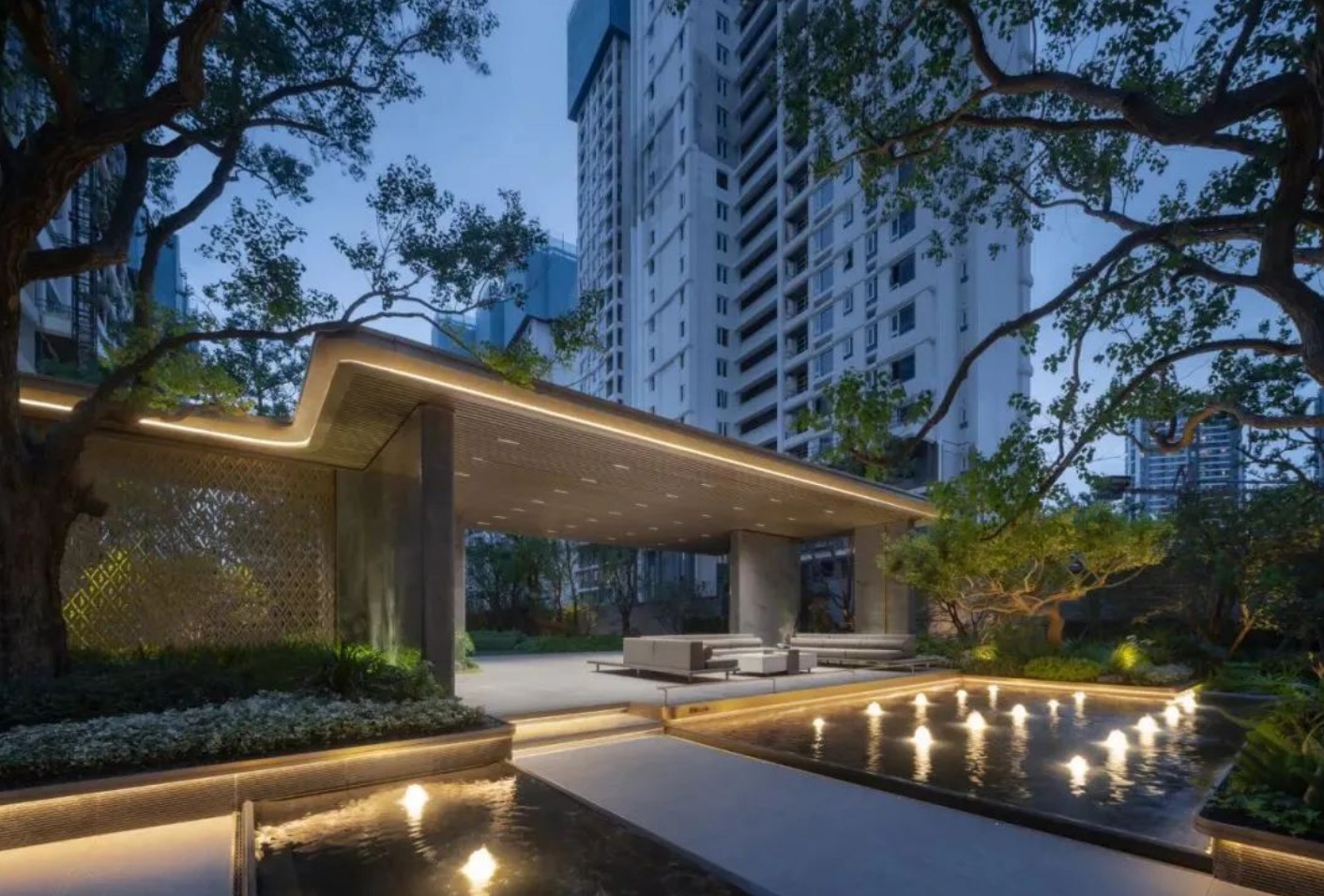 琉光水院的设计流畅的布局与干净的线条、在虚实之间完美结合。格调高级、大气且不乏典雅气质。利用场地高差关系做叠级,蓝色琉璃奢石与璀璨的雕塑结合,绿丛与水景衔接,在和煦的阳光下,整体的材质色彩搭配和谐、空间底色静雅,展现高雅品质。水的柔软、灵动,结合雕塑、星空灯等设计赋予空间独特幽美的属性,犹如置身现代艺术馆的空间艺术营造。每一处细节都流露出设计师的匠心独运,每一处景致都诉说着现代生活的诗意与浪漫。