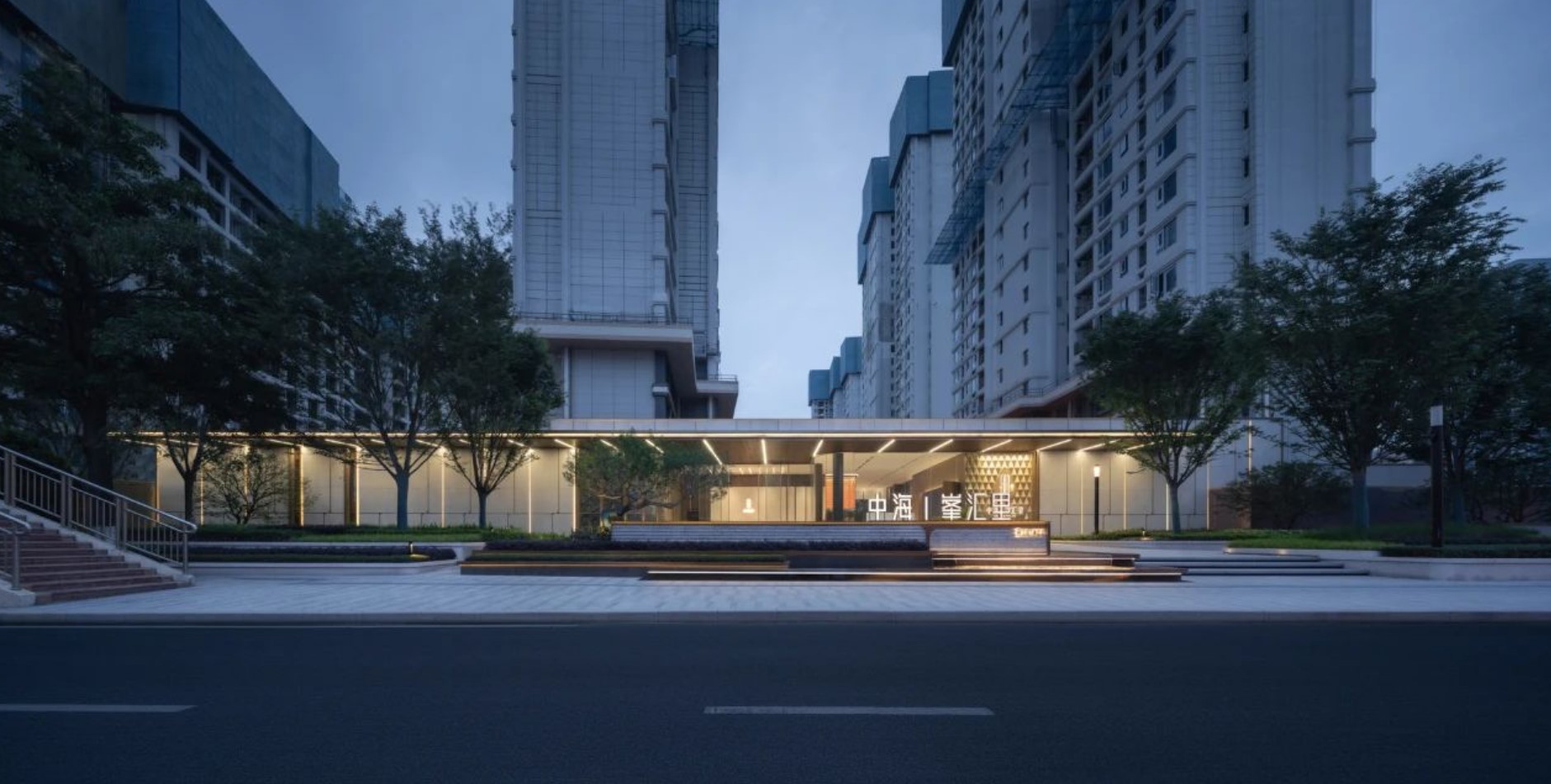 项目的入口设计以高品质的城市界面打造尊崇入口,沿城市道路展开的超级界面,打造迎宾礼序的第一重风景。前场全冠移植榉树迎宾,景墙立面采用浪花白花岗岩精工拼贴,充满艺术感的水景与绿色地被体块,多种组合成独特而大气的入口界面印象。通过将细腻光泽的金属、若隐若现的灯光,纹理感极强的铺装、色彩奢雅的花岗岩,作为奢侈符号和精巧质感的外化,细节之处彰显品质,拉开美好人居序幕。