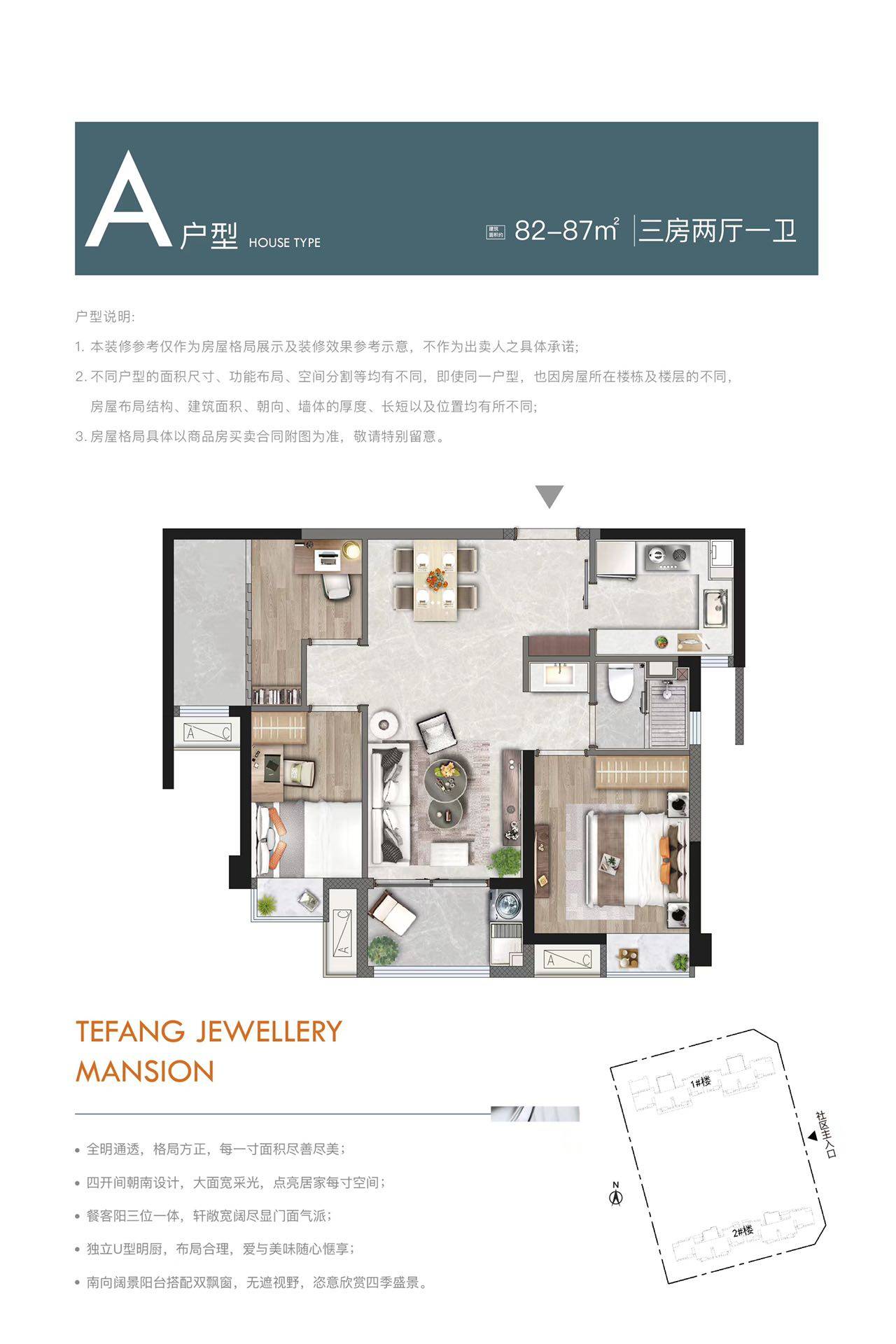 六、精致典雅的户型典范 特房新玥公馆的户型设计堪称典范之作。以D户型为例,约82㎡的三居室设计精致典雅。全明通透的格局让室内光线充足,四开间朝南的设计则保证了良好的采光和通风效果。餐客阳三位一体的空间布局让居家生活更显开阔,独立U型明厨则为烹饪时光增添了一份愉悦。南向阔景阳台和双飘窗的设计更是让居住者能够随时欣赏四季变换的美景。