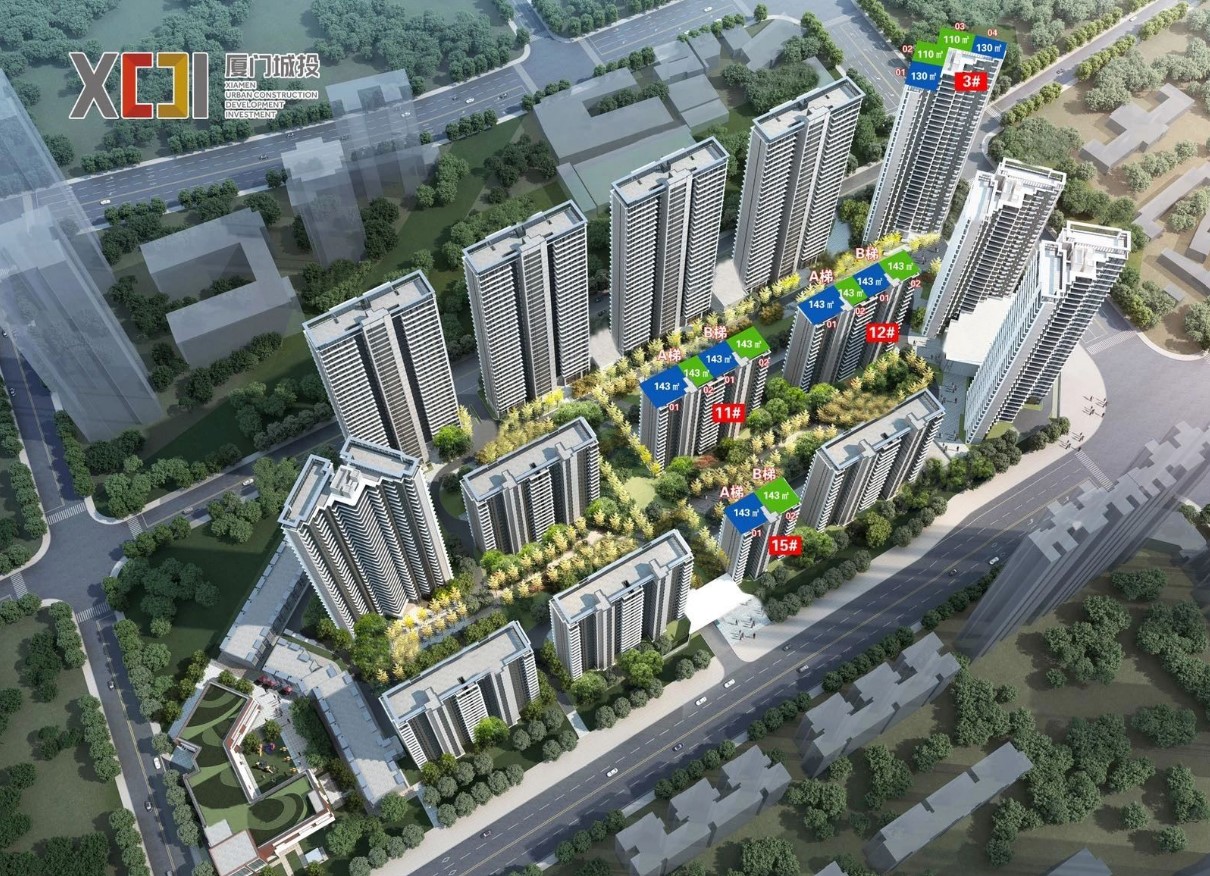 从楼栋分布图可以看出,3号楼提供建面约110平方米的三房和建面约130平方米的四房,总层数为33层,采用两梯四户的设计。11、12、15号楼则为两梯两户的小高层,面积均为约143平方米的四房。