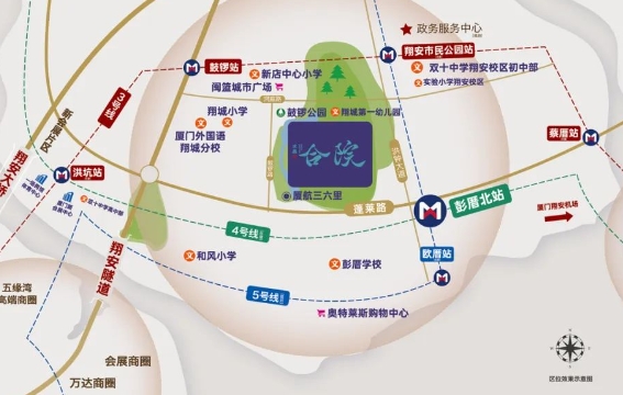 水晶合院傲立于厦门翔安南部新城的核心区域,位于翔安西路与洪钟大道交叉口西北侧。这里不仅是城市的政治、经济、文化中心,更是连接各大商圈和交通枢纽的咽喉之地。周边交通网络四通八达,紧邻翔安双地铁,距离3号线洋塘站约1500米,距离4号线彭厝北站约800米,双地铁出行便捷无忧。此外,项目距离翔安隧道及在建的翔安大桥直线距离约2.8公里,只需15分钟即可抵达岛内万达商圈,交通优势显而易见。