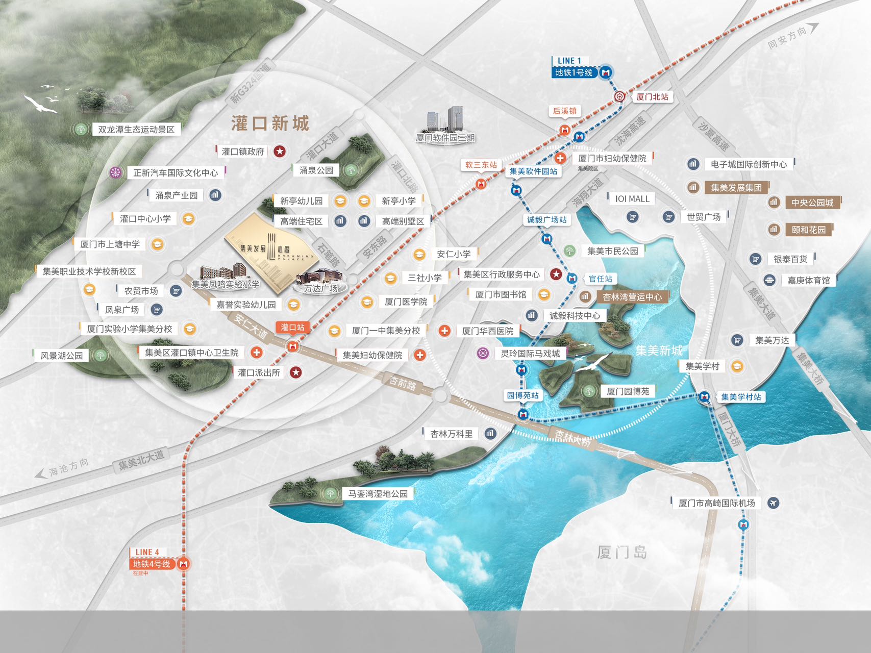 集美发展·心厝项目地处厦门集美区的核心地段,紧邻万达广场和集美新城。周边不仅有丰富的商业配套,如购物中心、餐饮娱乐等,还有两大城市公园——涌泉公园和风景湖公园。这两个公园总面积超过15万平方米,为居民提供了天然的“绿肺”,让居民在享受城市繁华的同时,也能亲近自然,呼吸新鲜空气。此外,项目周边还拥有优质的教育资源,如凤鸣实验小学和厦门一中(集美校区),为有孩子的家庭提供了良好的教育保障。这种繁华与自然的完美结合,使得集美发展·心厝项目成为年轻人置业的首选。