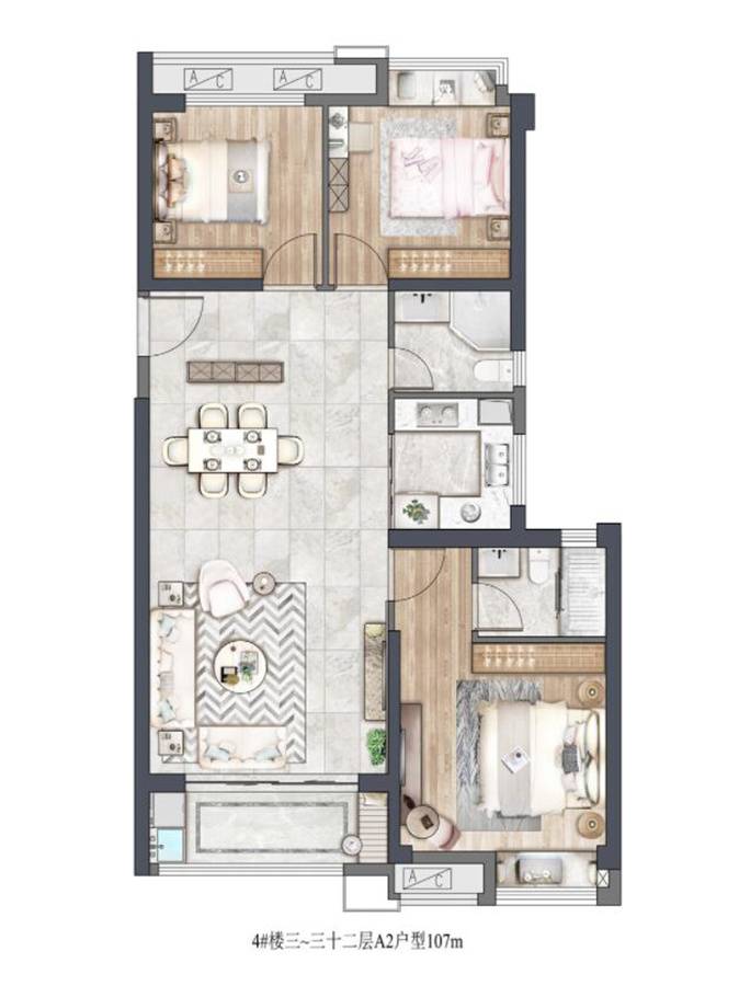 社区三幢楼,坐落于红线边界内四个角,南北一排,住宅为西南角楼栋。总高33层,分A、B两梯,每梯五户,尾端为95平三房,边套107、110三房。