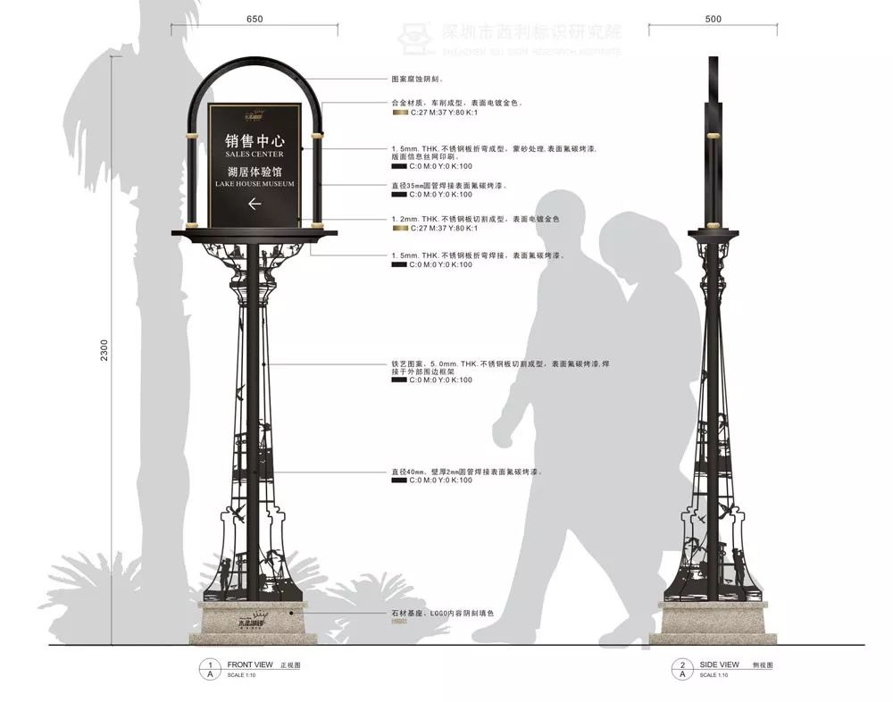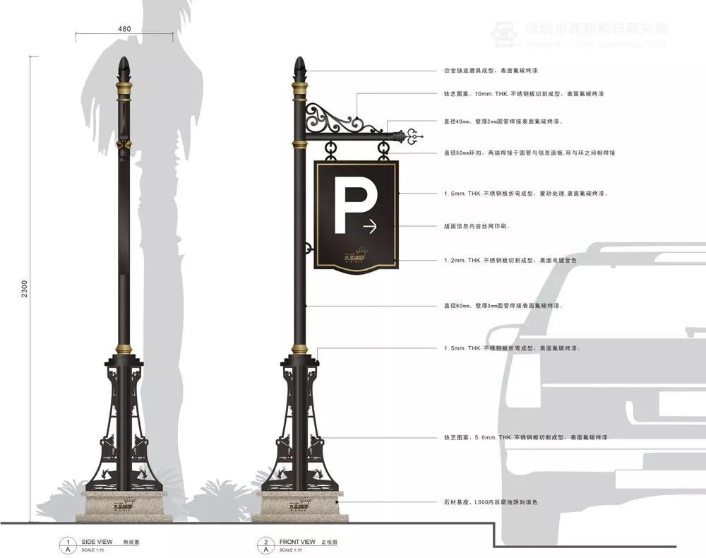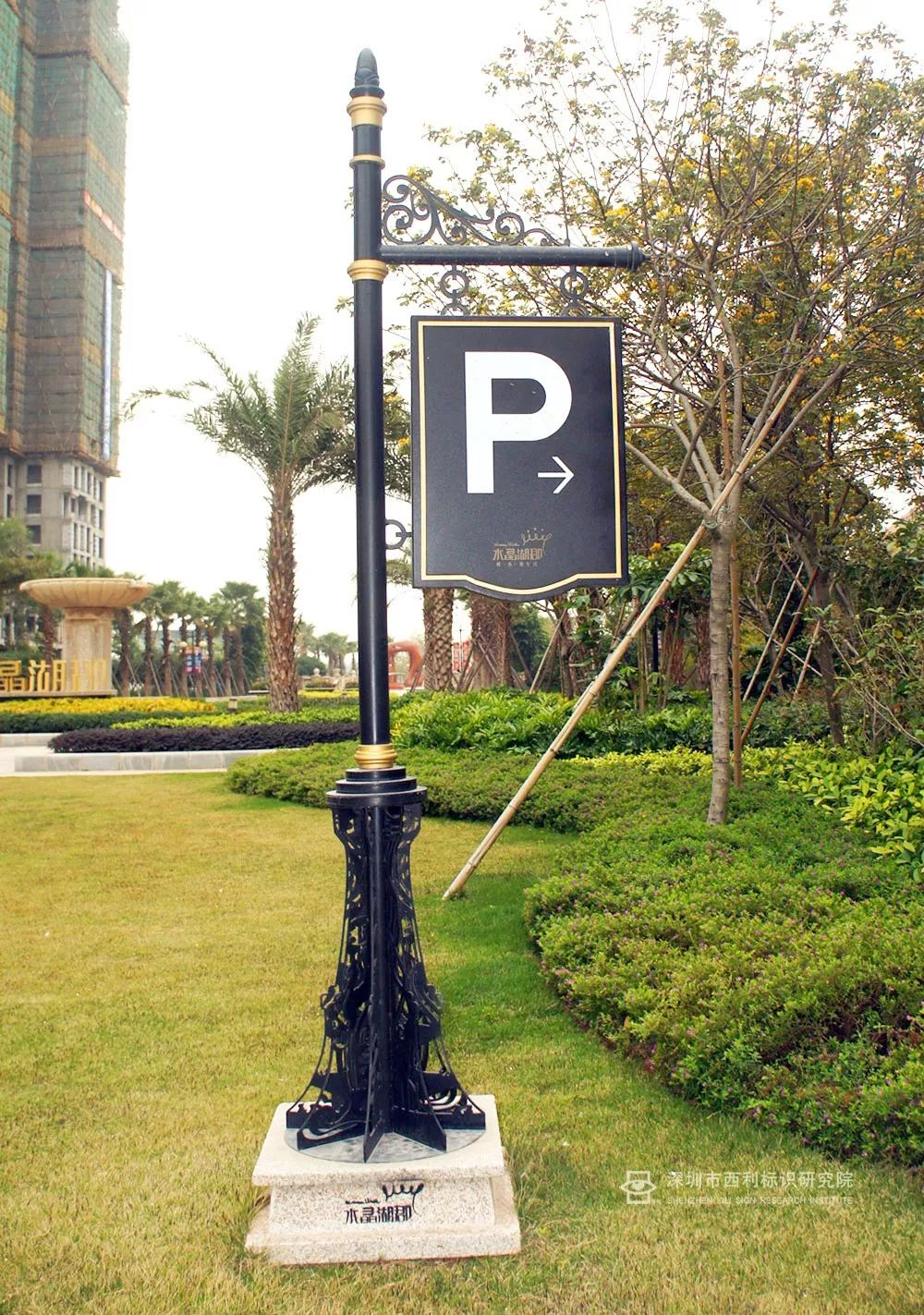 在标识材料的可以选择上,分别可以选择了不锈钢板做为主体、可以选择了石材做为底座。不锈钢板的材质与泛欧式的园林风格融为一体,散发出一类古典的优雅气质。